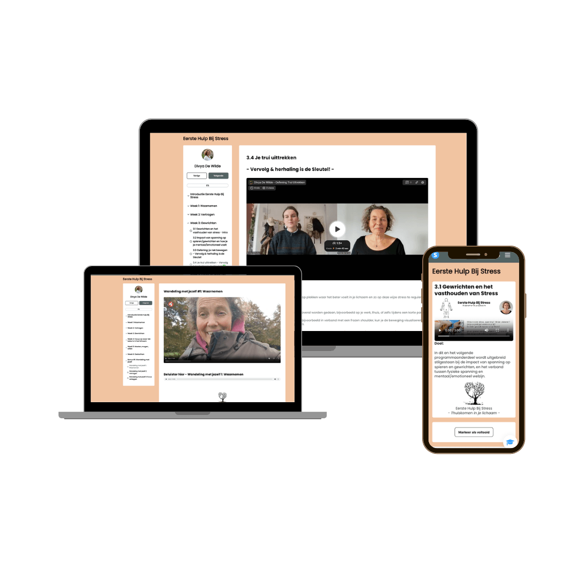 5+ modules met meer dan 20 lessen die je stap voor stap begeleiden naar meer rust, balans en grip op je stress.